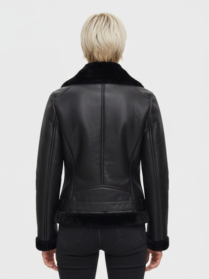 Designed with a flattering slim fit, this women’s shearling jacket sculpts your silhouette while allowing freedom of movement. Whether you’re heading out for a casual brunch or a night downtown, the sleek lines and tailored construction ensure you stand out for all the right reasons. Zip-up cuffs and metal hardware complete the look, delivering subtle edge and durability.
